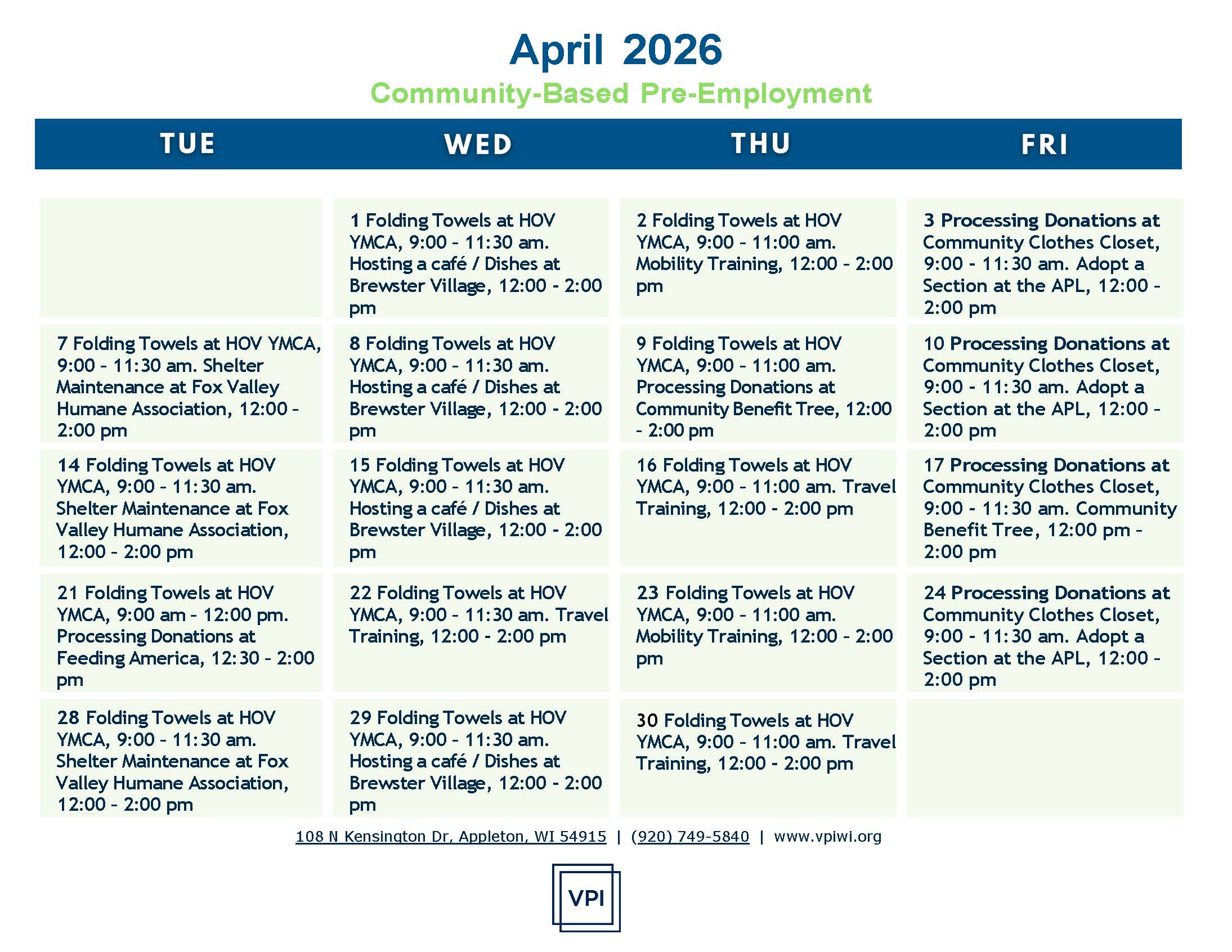Based 100% in our Fox Cities community, Community-Based Pre-Vocational Services provide individuals a chance to build on their work skills using our community as a campus. Activities are person-centered with participants taking an active role in planning their programming. Daily activities include volunteering, employability skills classes, job tours and work-related field trips, and fitness activities to build work stamina. We are now accepting referrals for this program.
